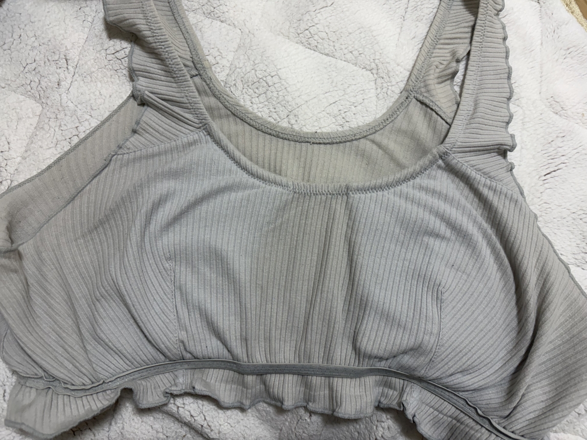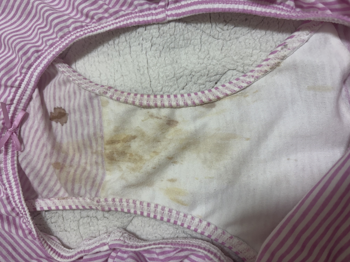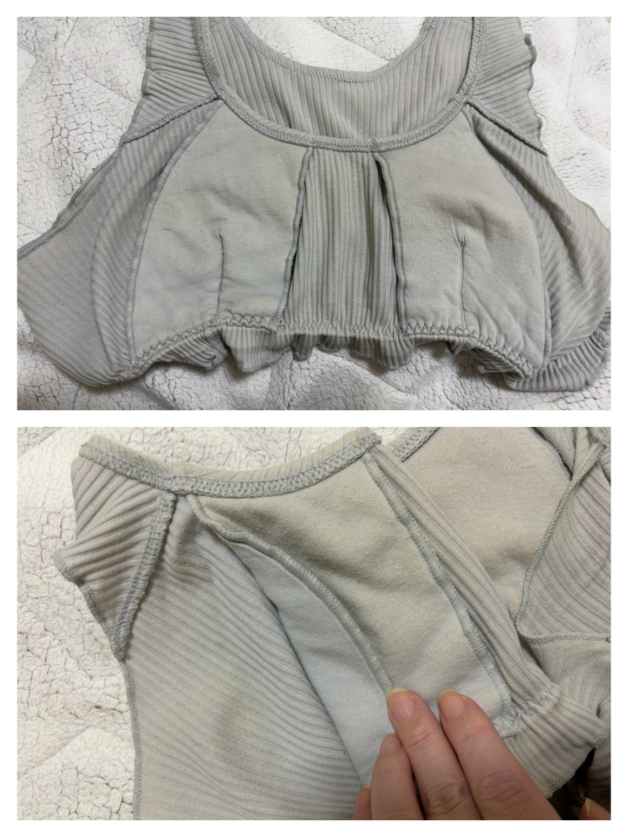 画像だと分かりにくいけど、2枚目画像だと胸の真ん中や背中部分が黄ばんでて、3枚目画像の下の画像はブラパッドの裏と下が変色してない綺麗な色で他は黄ばんでます。