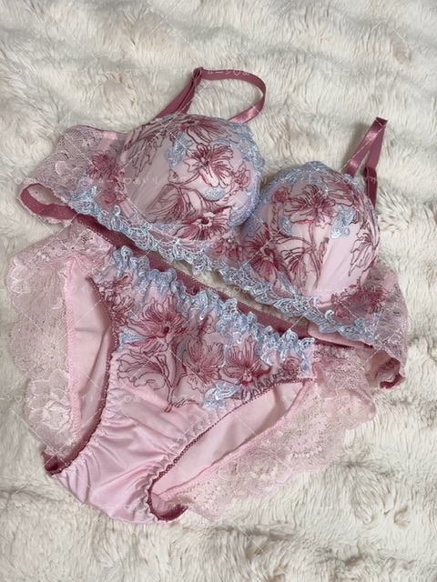 - この花柄のブラとショーツ、今日は朝から電車に乗って学校とバイト行って帰ってきた物です。
