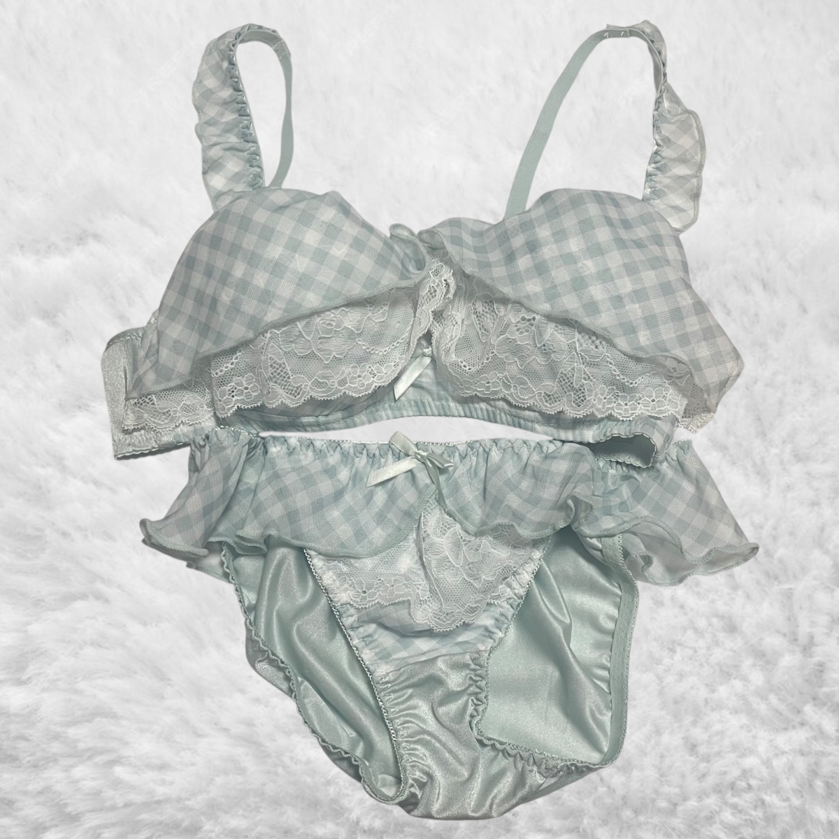 - フリフリレースが可愛い水色チェックのブラジャー&パンツセットです♡( ៸៸ › ⩊ ‹ ៸៸)♡